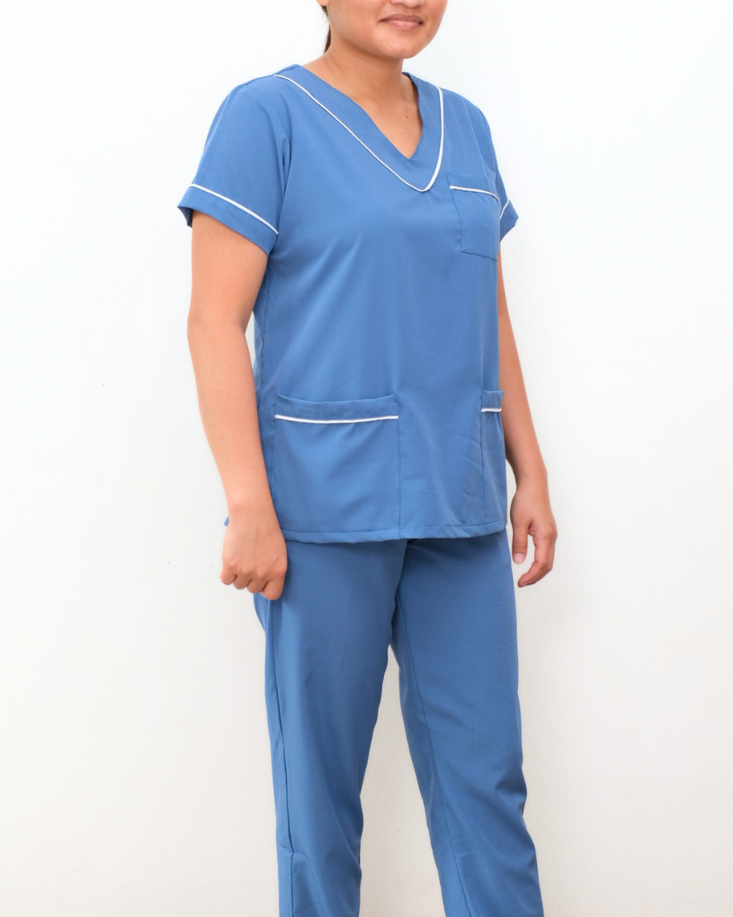 * If you choose Solid Black as an option for the piping and bottoms, fabric is Peach Twill. Peach still is lightweight and crease free. 65% cotton, 35% polyester