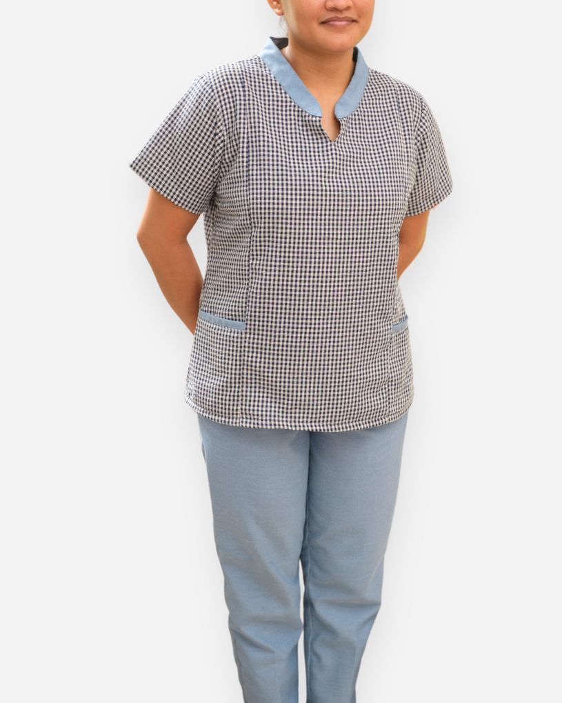 Though not 100% cotton, our CVC cotton which provides comfort and durability that make it a great fabric for uniforms. Minimal ironing needed because of the polyester content.